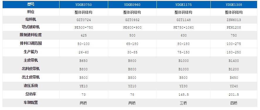 物料經給料機均勻輸送到破碎機內,鄂式破碎機作初步破碎后,通過圓振動篩構成閉路系統,實現物料的循環破碎,成品物料由輸送機輸出,進行連續破碎作業。輪胎式移動破碎站可以根據實際生產需要去除圓振動篩,實現對物料直接進行初步破碎,與其他破碎設備配套使用操作方便、靈活。