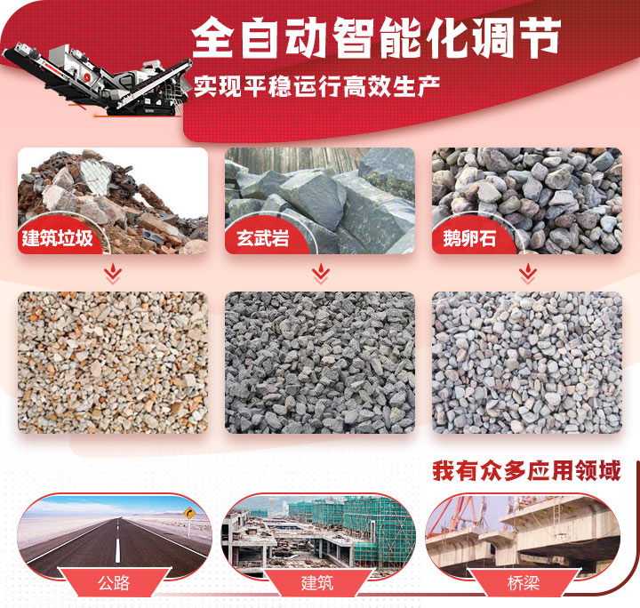 移動式破碎機,也可稱之為移動式破碎站、移動破碎站等,是新時代高新破碎技術下的必然產物,其主要特點就是可以移動式作業,行走自如,轉場更方便,保證設備生產安全的同時,工作運行更為可靠。華盛銘雙級移動破碎站一小時50-450噸的產量,客戶非常滿意,一條生產線能同時生產四種粒度的石子,砂子和粉料。由集中配電系統組合的移動式破碎機系列,經典型搭配移動顎式破碎機,移動反擊式破碎機,雙機搭配,實現石頭、建筑垃圾等粗碎、細碎作業。方便移動,只需一周時間就搭建好了整條生產線。比固定式破碎生產線快了將近三十天。